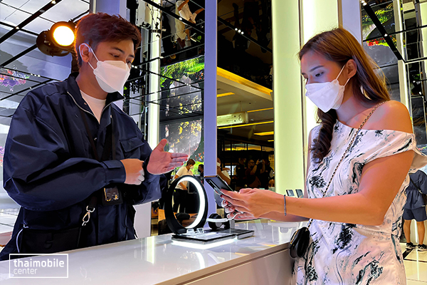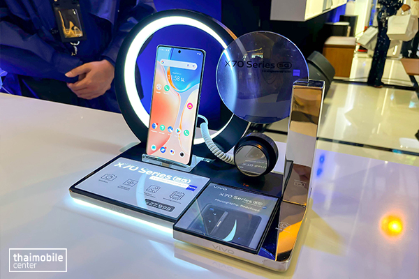 ที่โซนด้านหน้าจะมีการโชว์สินค้ารุ่นเด่นให้ลองเล่นกันโดยไม่มีสายล็อค อย่างในตอนนี้เครื่องที่นำมาโชว์จะเป็น vivo X70 Series
