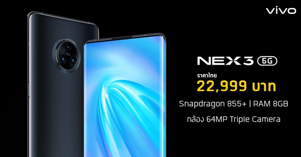 หลังจากที่ Vivo ได้นำสมาร์ทโฟนเรือธงอย่าง Vivo NEX 3 เข้ามาวางจำหน่ายในบ้านเราก่อนหน้านี้ ล่าสุดก็มีการนำรุ่นท็อปอย่าง Vivo NEX 3 5G เข้ามาวางจำหน่ายเพิ่มเติมด้วย โดยการเพิ่มความสามารถในการรองรับ 5G ในประเทศไทย สามารถใช้ 5G ได้ทันที (ยังไม่มีการระบุว่าใช้คลื่นไหนได้บ้าง) ในราคาเปิดตัวที่ 22,999 บาทเท่านั้น