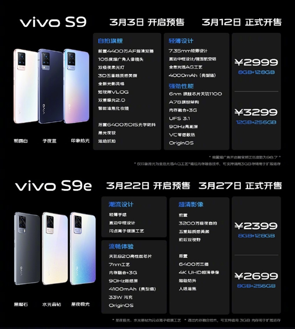 สำหรับ Vivo S9e 5G จะเป็นเวอร์ชันรองลงมาจาก Vivo S9 โดยมาพร้อมกับชิปเซ็ต Dimensity 820 และกล้องหน้าบนรอยบากรูปหยดน้ำมีความละเอียด 32 ล้านพิกเซล ส่วนสเปกด้านอื่นๆ ยังคงเหมือนกับ Vivo S9
