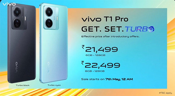 vivo T1 Pro 5G มีตัวเลือก 2 สี ได้แก่ สีฟ้า (Turbo Cyan) และสีดำ (Turbo Black) เตรียมวางจำหน่ายในประเทศอินเดียวันที่ 7 พฤษภาคมนี้เป็นต้นไป แบ่งออกเป็น 2 รุ่น ดังนี้