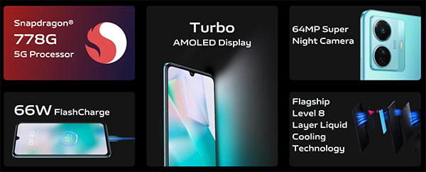 vivo T1 Pro 5G รองรับการเชื่อมต่อ 5G แบบ Dual-Mode (SA/NSA) ด้วยชิปเซ็ต Qualcomm Snapdragon 778G ระดับ 6nm รองรับระบบระบายความร้อนระดับเรือธงอย่าง Vapor Chamber Cooling ทั้งหมด 8 ชั้น ทำงานร่วมกับ RAM ขนาดสูงสุด 8GB + เทคโนโลยี Extended RAM 2.0 ในการเพิ่ม RAM เสมือนได้สูงสุด 4GB และมีแบตเตอรี่ความจุ 4700 mAh รองรับเทคโนโลยีชาร์จเร็ว 66W FlashCharge ที่สามารถชาร์จจากระดับ 1-50% ได้ในเวลา 18 นาที