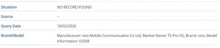 vivo T5 Pro โผล่ฐานข้อมูล IMEI แล้ว พร้อมหมายเลขรุ่น V2568 ลุ้นเปิดตัวในอินเดีย