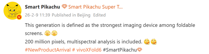 ในข่าวหลุดดังกล่าว แหล่งข่าว Smart Pikachu อ้างว่า vivo X Fold 6 กำลังถูกพัฒนาให้เป็นมือถือจอพับที่เน้นเรื่องการถ่ายภาพมากที่สุด โดยเขาเสริมว่ามีรายงานการทดสอบอุปกรณ์รุ่นนี้ด้วยกล้องความละเอียด 200 ล้านพิกเซล และเซนเซอร์ Multispectral