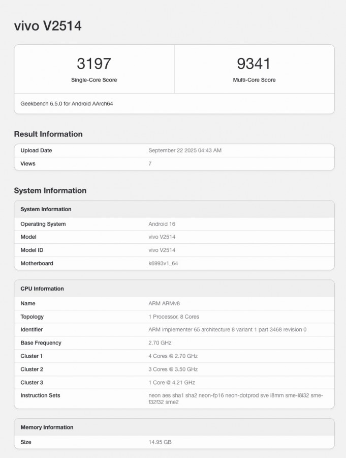 vivo X300 Pro (โมเดล V2514) ทำคะแนนแบบ Single-core ได้ 3,177 และ Multi-core ได้ 9,701 คะแนน ซึ่งสอดคล้องกับผลทดสอบ Geekbench ก่อนหน้านี้ของ vivo X300 โดยคะแนนดังกล่าวเพิ่มขึ้นเล็กน้อยเมื่อเทียบกับ Dimensity 9400 แต่ควรคำนึงว่านี่เป็นผลจากเครื่องทดสอบที่ยังไม่วางจำหน่ายจริง
