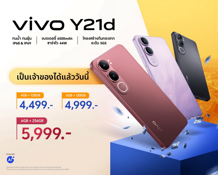 vivo เอาใจผู้ใช้งานที่มองหาทั้งความทนทานและความคุ้มค่าด้วยการเปิดตัวสมาร์ตโฟนรุ่นใหม่ล่าสุด vivo Y21d ที่โดดเด่นด้วยสเปกเกินราคา โดยเป็นครั้งแรกของสมาร์ตโฟนตระกูล Y Series ที่มาพร้อมมาตรฐานทนน้ำทนฝุ่น IP68 & IP69 เสริมความแข็งแกร่งด้วยโครงสร้างกันกระแทกรอบด้าน มอบความมั่นใจในทุกการพกพา นอกจากนี้ยังเป็นสมาร์ตโฟน vivo รุ่นแรกในระดับราคาเดียวกันที่จัดเต็มแบตเตอรี่ BlueVolt ความจุสูงถึง 6500mAh เพื่อรองรับทุกการใช้งานในชีวิตประจำวันอย่างราบรื่น นำเสนอประสบการณ์ความบันเทิงเต็มอารมณ์ด้วยลำโพงสเตอริโอคู่เสียงดังทรงพลังที่สามารถบูสต์ได้สูงสุดถึง 400% ให้ผู้ใช้งานได้ดื่มด่ำกับการรับชมเอนเตอร์เทนเมนต์เต็มอิ่มทุกรายละเอียด พร้อมวางจำหน่ายในประเทศไทยแล้วตั้งแต่วันนี้ ในราคาเริ่มต้นเพียง 4,499 บาท