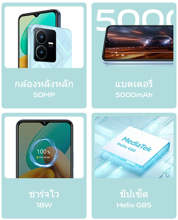 vivo Y22 ชูโรงที่กล้องหลัก AI 50MP พร้อมเซนเซอร์ขนาดใหญ่ ถ่ายคมชัดทั้งกลางวัน - กลางคืน และใช้งานได้ยาวนานตลอดวันด้วยแบตเตอรี่ความจุ 5000 mAh รองรับเทคโนโลยีชาร์จเร็ว 18W Fast Charging รวมถึงเลือกใช้ชิปเซ็ต MediaTek Helio G85 จับคู่กับ RAM 4GB + ROM 64GB