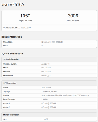 จากภาพหน้าจอที่หลุดออกมาพบว่าสมาร์ตโฟน vivo หมายเลขรุ่น V2516A ได้ปรากฏในฐานข้อมูล Geekbench โดยระบุว่าขับเคลื่อนด้วยชิปเซตที่มีซีพียูแบบ 8 คอร์ แบ่งเป็น 4 คอร์ ความเร็ว 2.0GHz และอีก 4 คอร์ ความเร็ว 2.6GHz ส่วนกราฟิกใช้ GPU Mali-G615 MC2 ซึ่งข้อมูลทั้งหมดนี้บ่งชี้ว่ารุ่นดังกล่าวใช้ชิป Dimensity 7400