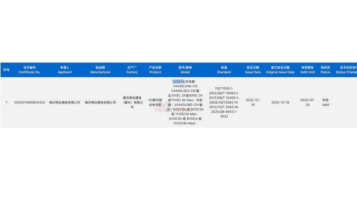 นอกจากนี้ ยังมีข่าวอีกด้านว่า สมาร์ตโฟน vivo รุ่นใหม่ที่ใช้หมายเลขโมเดล V2531A เพิ่งผ่านการรับรองจาก 3C ซึ่งเผยว่าเครื่องจะรองรับการชาร์จแบบสายกำลังไฟ 44W
