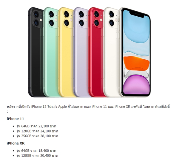 ตามธรรมเนียมแล้ว Apple จะมีการลดราคาวางจำหน่ายของไอโฟนรุ่นเก่าทันทีหลังจากที่ไอโฟนรุ่นใหม่เปิดตัว ซึ่งหลังจากที่ iPhone 12 เปิดตัวอย่างเป็นทางการ Apple ก็ทำการลดราคารุ่นเก่าอย่าง iPhone 11 ลงทันที 2,800 บาท และลดราคา iPhone Xr ลง 3,500 บาท แต่ต้องไม่ลืมว่า แม้ราคาไอโฟนจะลดลง แต่หากผู้ใช้ทำการซื้อกับ Apple Store ก็จำเป็นที่จะต้องซื้อหัวชาร์จ และหูฟังเพิ่มเติมรวมแล้ว 1,380 บาท (ในกรณีที่คุณยังไม่มีทั้งหูฟัง และหัวชาร์จที่เป็นพอร์ต USB-C) ซึ่งหมายความว่าจริงๆ แล้ว Apple ลดราคา iPhone 11 ไป 1,420 บาท และลดราคา iPhone Xr ไป 2,120 บาทเท่านั้น ซึ่งต่างจากกรณีเมื่อปี 2018 ที่ผ่านมา ที่ Apple ลดราคา iPhone 8 Series และ iPhone Xr ทันที 8,000 บาทหลังจากที่ iPhone 11 Series เปิดตัวอย่างเป็นทางการ