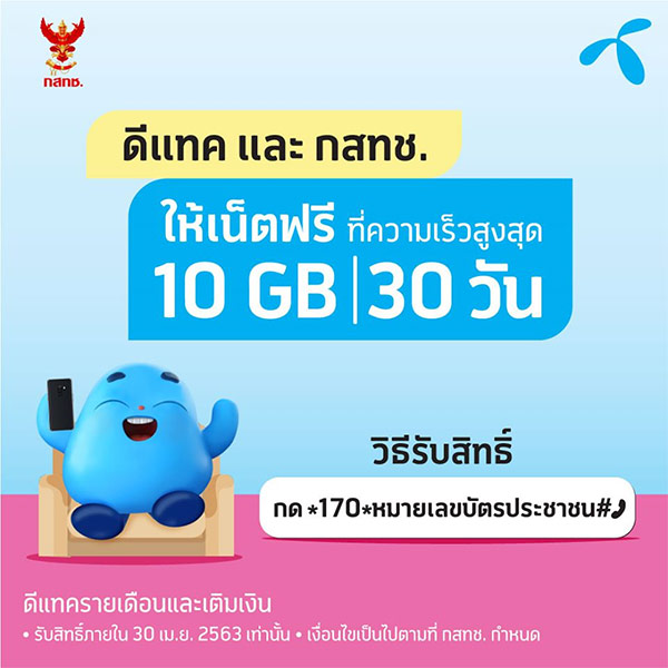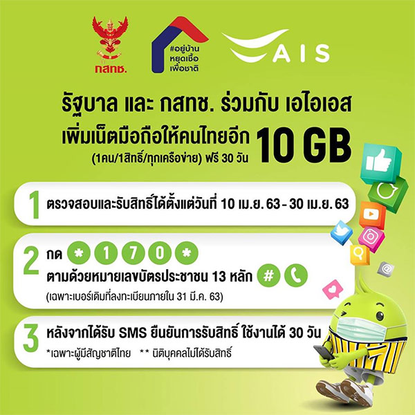 เริ่มเป็นวันแรกแล้วนะคะสำหรับการรับอินเทอร์เน็ตมือถือเพิ่มฟรี 10GB จากทาง กสทช. เพื่อสนับสนุนการทำงานที่บ้าน (Work From Home) เพื่อลดการแพร่ของไวรัส COVID-19 และสามารถรับสิทธิ์ได้ทุกค่าย ทุกเครือข่าย เพียงกด *170* เลขบัตรประชาชน 13 หลัก # โทรออก