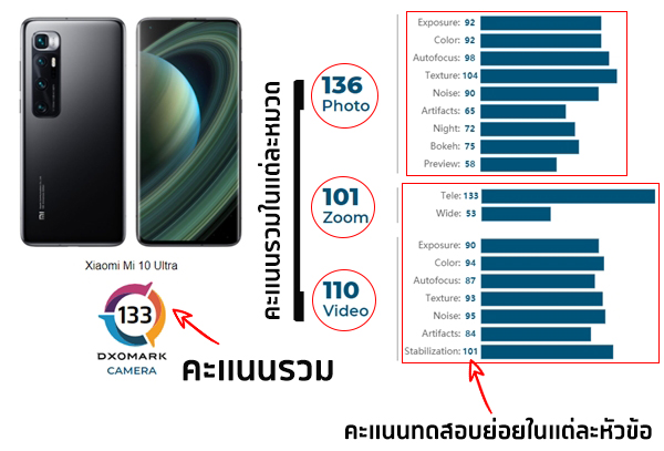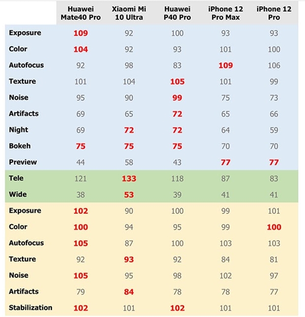 ยกตัวอย่างเช่น ในรุ่น HUAWEI Mate40 Pro ที่ได้รับคะแนนทดสอบโดยรวมสูงที่สุดในโลก ณ ชั่วโมงด้วยคะแนนรวม 136 คะแนน จะเห็นได้ว่า การทดสอบถ่ายภาพกลางคืน (Night), การพรีวิวภาพ (Preview), การจัดการร่องรอยบนซึ่งเกิดจากซอฟท์แวร์บนภาพถ่าย (Artifacts), การถ่ายภาพซูม, การถ่ายภาพมุมกว้าง ไปจนถึงการเก็บรายละเอียด HUAWEI Mate40 Pro กลับทำคะแนนทดสอบได้น้อยกว่ามือถือรุ่นอื่นๆ ที่อยู่ในระดับท็อป 5 ของ DxOMark