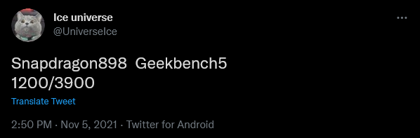 อีกด้านหนึ่ง แหล่งข่าวหลุดอีกเจ้าอย่าง IceUniverse ก็ได้เผยผล benchmark ของชิปเซ็ต Snapdragon 898 บนแพล็ตฟอร์ม Geekbench 5 โดยทำคะแนน single-core และ multi-core ได้ 1200 และ 3900 คะแนนตามลำดับ ซึ่งสูงกว่า Snapdragon 888+ ประมาณ 15% อย่างไรก็ดี ผลการทดสอบดังกล่าวอาจไม่ได้มาจากฮาร์ดแวร์ที่สมบูรณ์ เมื่อวางจำหน่ายจริงจึงอาจมีประสิทธิภาพที่แตกต่างไปจากนี้ได้