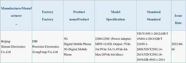 สมาร์ทโฟน Xiaomi รหัส 2206122SC ปรากฏบนฐานข้อมูลของหน่วยงาน 3C โดยมาพร้อมกับหัวชาร์จรหัส MDY-12-ED ซึ่งคาดว่าจะรองรับระบบชาร์จไว 120W ลือกันว่าสมาร์ทโฟนรุ่นนี้อาจเป็น Xiaomi 12S Pro ที่ใช้ชิปเซ็ต Snapdragon 8 Gen 1