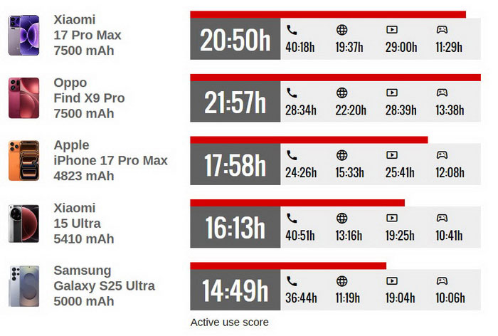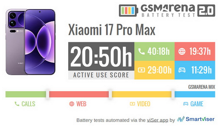 Xiaomi 17 Pro Max ใช้ประโยชน์จากแบตเตอรี่ขนาดใหญ่ 7,500mAh ได้อย่างเต็มประสิทธิภาพ หากจะหาสมาร์ตโฟนที่มีคะแนน Active Use ดีกว่านี้ ต้องดูที่ OPPO Find X9 Pro เท่านั้น อย่างไรก็ตาม Xiaomi ทำได้ดีกว่าในบางการทดสอบ เช่น มีเวลาโทรได้นานกว่าถึง 12 ชั่วโมง และเล่นวิดีโอได้นานกว่านิดหน่อย รวมสูงสุดถึง 29 ชั่วโมง ของการเล่นวิดีโอ ถือว่าน่าประทับใจมาก