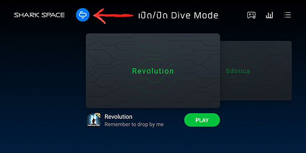 Dive Mode เป็นโหมดสำหรับการเล่นเกมผ่านเครือข่าย 4G ซึ่งบางคนอาจจะเน็ตหลุดและเด้งออกจากเกมเมื่อมีสายโทรเข้า แต่เมื่อเปิดโหมดนี้ จะเป็นการปิดฟังก์ชันการโทรและเปิดแค่การรับส่งข้อมูลผ่านเครือข่าย 4G เท่านั้น (Diving Mode จะยุติทันทีเมื่อออกจาก Shark Space)