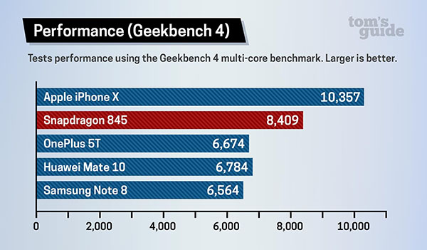 กราฟ benchmark แสดงให้เห็นว่าคะแนนของ Snapdragon 845 ยังคงตามหลัง A11 Bionic ที่มา : Tom's Guide