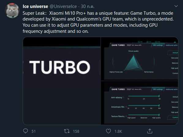 Ice Universe แหล่งข่าวหลุดชื่อดังของวงการ เปิดเผยผ่าน Twitter ว่า Xiaomi Mi 10 Pro+ จะมีฟีเจอร์พิเศษในแอป Game Turbo ที่ทำให้ผู้ใช้ปรับแต่งการทำงานของหน่วยประมวลผลกราฟิกหรือ GPU ในเชิงลึกได้ ซึ่ง Xiaomi ได้ร่วมมือกับทีมของ Qualcomm ในการพัฒนาฟีเจอร์นี้ขึ้นมา พร้อมทั้งได้แนบภาพสกรีนช็อตที่เผยให้เห็นเมนูการปรับแต่งโหมดการประมวลผลที่เลือกได้ว่าจะให้เน้นเฟรมเรต, คุณภาพกราฟิก หรือความลื่น มากน้อยแค่ไหน นอกจากนี้ยังสามารถปรับระดับการลดรอยหยัก (anti-aliasing), ความละเอียดของ texture, และรายละเอียดของภาพในระยะไกล (anisotropic filters) ได้ด้วย