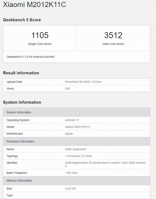 อุปกรณ์ Xiaomi รหัส M2012K11C ได้ผ่านการทดสอบ benchmark บน Geekbench โดยใช้ระบบปฏิบัติการ Android 11 มีหน่วยความจำ RAM 6GB และใช้ชิปเซ็ตที่เชื่อว่าเป็น Snapdragon 875 สามารถทำคะแนนแบบ single-core ได้ 1105 คะแนน และแบบ mukti-core ได้ 3512 คะแนน มีความเป็นไปได้สูงที่อุปกรณ์รุ่นนี้คือสมาร์ทโฟนเรือธงรุ่นใหม่ Xiaomi Mi 11
