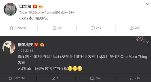 โดยเมื่อไม่นานมานี้ @IceUniverse แหล่งข่าวชื่อดังจากประเทศจีนที่มักจะเปิดเผยข้อมูลเกี่ยวกับมือถือรุ่นใหม่ๆ ได้อย่างแม่นยำ ได้ออกมาระบุว่า ทาง Xiaomi วางแผนที่จะเปิดตัุว Xiaomi Mi 7 ในช่วงสิ้นเดือนพฤษภาคมที่กำลังจะถึงนี้ พร้อมกับมีเซอร์ไพร์สด้วยการเปิดตัวนาฬิกาอัจฉริยะรุ่นล่าสุดอย่าง Xiaomi Mi Band 3 ให้เห็นภายในงานเดียวกันด้วย