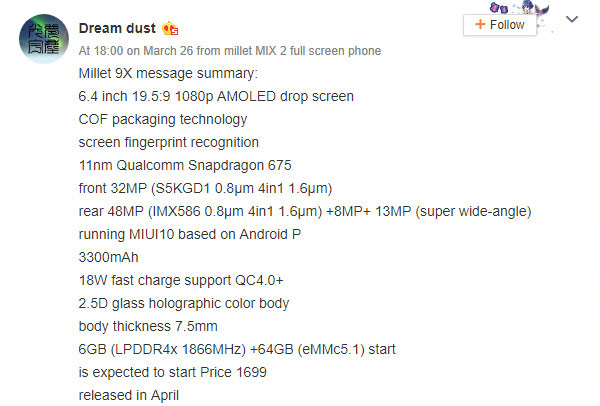 พร้อมกันนี้ก็มีการเผยคุณสมบัติตัวเครื่องในเบื้องต้นของ Xiaomi Mi 9X ว่าที่รุ่นใหม่ดังกล่าวออกมาด้วยเช่นกัน โดยมีรายละเอียดดังนี้