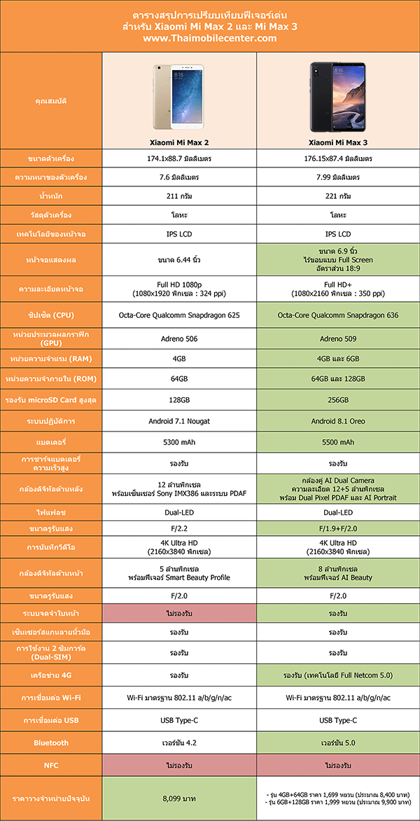 เป็นอย่างไรกันบ้างคะสำหรับการเปรียบเทียบสองสมาร์ทโฟนจอใหญ่แบตอึดซีรีส์ยอดนิยมจากค่าย Xiaomi จะเห็นได้ว่า Xiaomi Mi Max 3 มาพร้อมการเปลี่ยนแปลง และได้รับการอัปเกรดขึ้นจากเดิมในหลายด้าน ตั้งแต่การดีไซน์ตัวเครื่องที่พลิกโฉมไปจากเดิมแบบหมดจดด้วยจอไร้ขอบแบบสมัยนิยมอย่าง Full Screen พร้อมขนาดใหญ่ 6.9 นิ้วในอัตราส่วน 18:9 ที่กว้าง และยาวกว่าเดิม โดยรองรับการแสดงผลระดับ Full HD+ และอัปเกรดมาใช้งานชิปเซ็ตรุ่นใหม่อย่าง Qualcomm Snapdragon 636 จับคู่กับหน่วยความจำแรม (RAM) สูงสุดที่ 6GB บนระบบปฏิบัติการ Android 8.1 Oreo เวอร์ชันล่าสุด พร้อมกับแบตเตอรี่จุใจกว่าเดิมที่ความจุ 5500 mAh และรองรับเทคโนโลยีชาร์จเร็ว Quick Charge 3.0 เพื่อการใช้งานที่ไม่ขาดตอน