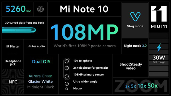 วิดีโอชุดแรกเน้นไปที่จุดขายสำคัญคือประสิทธิภาพของกล้องหลัง 5 ตัว โดยเฉพาะคุณสมบัติด้านการซูม ที่ซูมแบบ Optical ได้สูงสุดถึง 5 เท่า อีกทั้ง Xiaomi Mi Note 10 ยังเป็นสมาร์ทโฟนรุ่นแรกในวงการที่มีกล้องเลนส์ Telephoto 2 ตัว (2x และ 5x) อีกด้วย ส่วนกล้องตัวอื่นๆ ประกอบด้วยกล้องหลักความละเอียด 108 ล้านพิกเซล, กล้องเลนส์ Ultra Wide Angle ความละเอียด 20 ล้านพิกเซล และกล้องเลนส์ Super Macro ความละเอียด 2 ล้านพิกเซล จึงถ่ายได้ครบทุกระยะไม่ว่าจะกว้าง, ใกล้ หรือไกล ส่วนอีกคลิปหนึ่งโปรโมตในเรื่องดีไซน์ภายนอก ที่มีจุดเด่นอยู่ที่หน้าจอ Super AMOLED ขนาด 6.47 นิ้วขอบโค้งสองด้าน และบอดี้เคลือบผิวสะท้อนแสง ซึ่งเป็นดีไซน์ที่กำลังนิยมกันอยู่ในขณะนี้