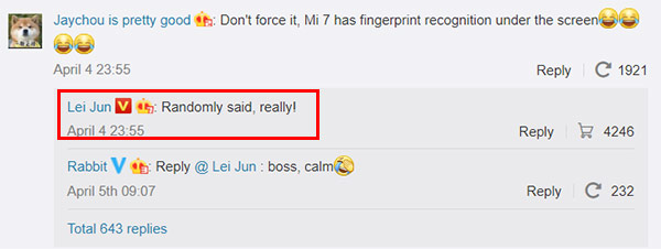 ผู้ใช้รายหนึ่งคอมเมนท์สอบถามเกี่ยวกับการนำเทคโนโลยีฝังเซ็นเซอร์สแกนลายนิ้วมือไว้ที่ใต้หน้าจอบน Xiaomi Mi7 ว่าที่เรือธงรุ่นใหม่จากทาง Xiaomi บน Weibo เว็บโซเชียลมีเดียของประเทศจีน ซึ่งทาง Lei Jun ผู้ดำรงตำแหน่ง CEO ของ Xiaomi ได้เข้ามาตอบคำถามดังกล่าวด้วยตัวเองว่าเป็นความจริง เรียกได้ว่าสร้างความเซอร์ไพรส์อยู่ไม่น้อยเลยทีเดียว