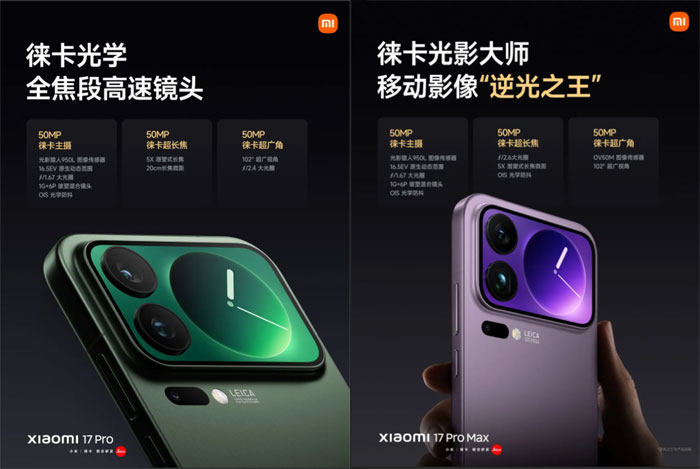 Xiaomi 17 Pro และ Xiaomi 17 Pro Max กล้องของทั้งสองรุ่นใช้ระบบ Leica Light and Shadow Master ใหม่ พร้อมเซนเซอร์ 50MP Light Fusion 950L ที่รองรับเทคโนโลยี LOFIC HDR และไดนามิกเรนจ์ 16.5EV รุ่น Xiaomi 17 Pro มาพร้อมระบบกล้อง 3 ตัวที่หลากหลาย โดยมีเลนส์เทเลโฟโต้มาโครแบบปริทรรศน์ f/3.0 ระยะโฟกัสใกล้สุดเพียง 20 ซม. ขณะที่รุ่น Xiaomi 17 Pro Max ยกระดับขึ้นด้วยกล้อง 3 ตัวขั้นสูง ประกอบด้วย กล้องหลัก 50MP ที่มีไดนามิกเรนจ์เหนือกว่า, เลนส์เทเลโฟโต้ปริทรรศน์ที่รับแสงได้มากขึ้น 30% รูรับแสง f/2.6 พร้อม OIS และกล้องอัลตร้าไวด์ 17 มม. ที่มี AF ซีรีส์ Pro ยังเพิ่มกล้องหน้า 50MP ที่รองรับ DAG HDR พร้อมการถ่ายวิดีโอ Dolby Vision 4K ครบทุกทางยาวโฟกัส
