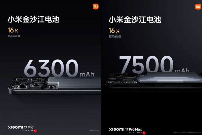 Xiaomi 17 Pro ใช้แบตเตอรี่ 6,300mAh รองรับชาร์จไวแบบสาย 100W และไร้สาย 50W ส่วน Xiaomi 17 Pro Max อัปเกรดครั้งใหญ่ด้วยแบตเตอรี่ Jinshajiang 7,500mAh — ขนาดใหญ่ที่สุดของ Xiaomi โดยใช้เทคโนโลยีแบตเตอรี่แบบ L-shaped เพื่อเพิ่มความหนาแน่นพลังงาน รองรับการชาร์จสาย 100W ไร้สาย 50W และยังเพิ่มการชาร์จย้อนกลับไร้สาย 20W