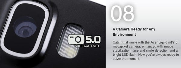 - กล้องดิจิตอลในตัว ความละเอียดระดับ 5 ล้านพิกเซล (2592x1944 Pixels) พร้อมไฟแฟลชแบบ LED ในตัว และระบบโฟกัสภาพอัตโนมัติ