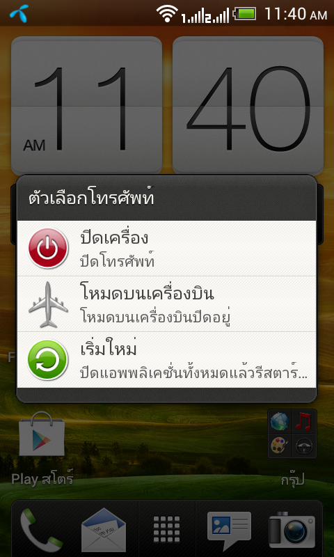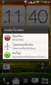 เมื่อกดปุ่มล็อกหน้าจอค้างเอาไว้ ก็จะมีเมนูสำหรับการ เปิดเครื่อง, โหมดสำหรับการใช้งานบนเครื่องบิน และ รีสตาร์ทเครื่อง