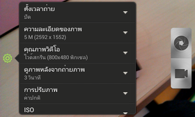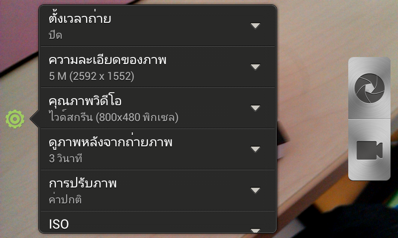 เมื่อกดที่ไอคอนตั้งค่า จะมีหน้าต่างการตั้งค่าการถ่ายภาพมาให้เราเลือก ได้แก่ ตั้งเวลาถ่ายภาพ, ความละเอียดของภาพ, คุณภาพของวิดีโอ,