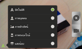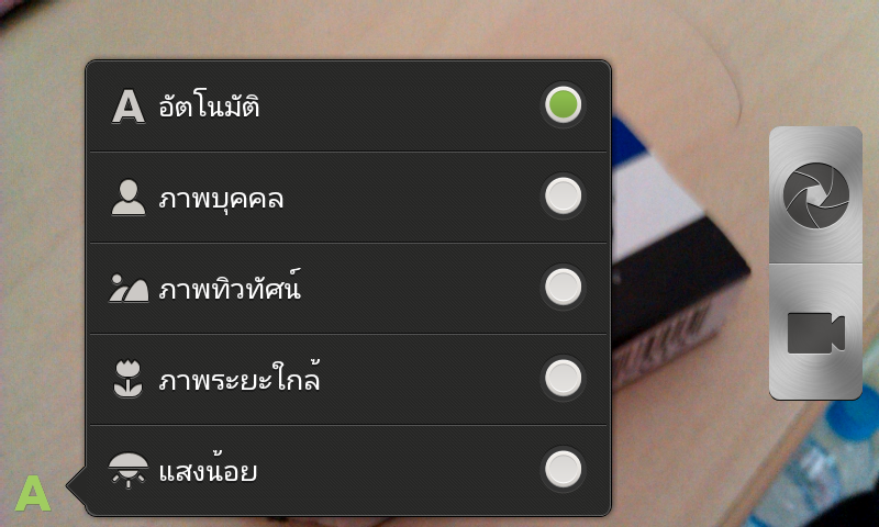 และเมื่อกดที่ไอคอนตัว A จะเป็นการเลือกโหมดของการถ่ายภาพ เช่น โหมดอัตโนมัติ, การถ่ายภาพบุคคล และ การถ่ายภาพทิวทัศน์ เป็นต้น