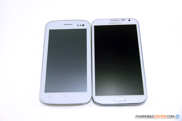 และเมื่อนำมาเทียบแบบใกล้ๆ จะเห็นได้ว่า Samsung Galaxy Note II มีตัวเครื่องที่กว้างและยาวกว่า i-mobile IQ5 จึงทำให้ i-mobile IQ5 จับถนัดมือมากกว่านั่นเอง