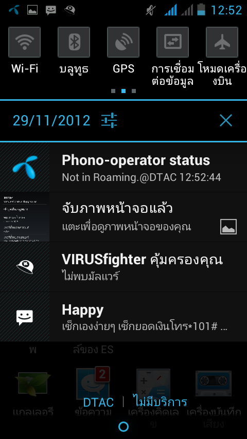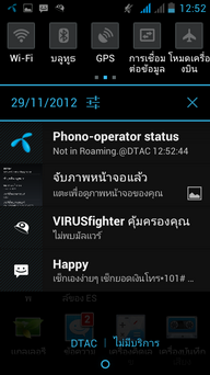 สำหรับ Notification Bar จะมีการแจ้งเตือนต่างๆ ของเครื่อง รวมถึงฟังก์ชันลัดที่สามารถเปิดใช้งานต่างๆ ได้ทันที เช่น Wifi, 3G, และสามารถเข้าไปในส่วนของการตั้งค่าด้วยคีย์ลัดผ่านทาง Notification Bar ได้ทันที