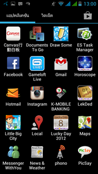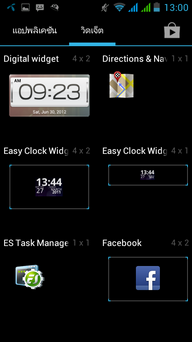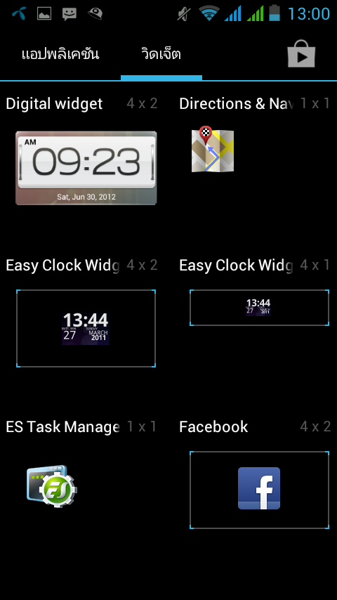 ในส่วนของหน้าแอพพลิเคชั่นจะแบ่งออกเป็น 2 ส่วนคือ แอพพลิเคชั่นของตัวเครื่อง และ Widget (สังเกตด้านขวาบนของหน้าจอเราสามารถเข้า Play Store ได้ทันทีผ่านทางไอค่อน Play Store)