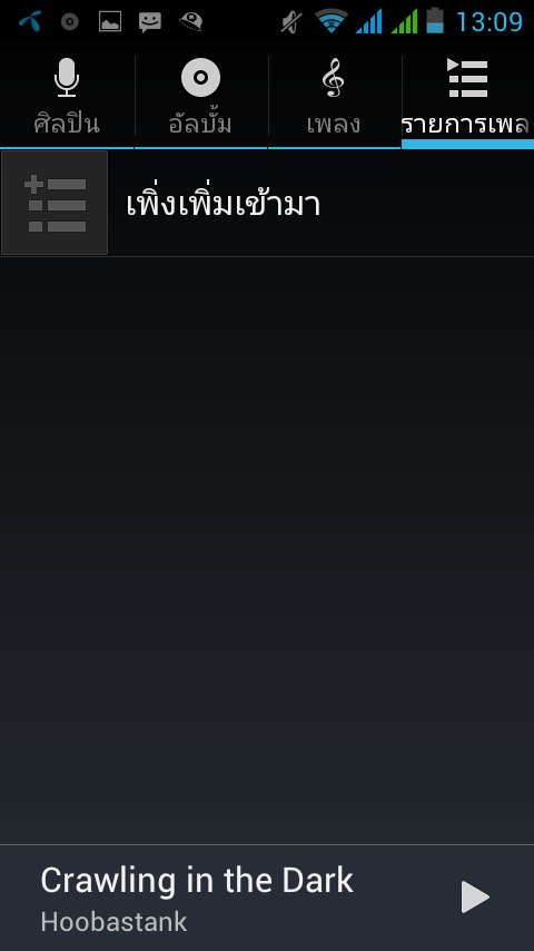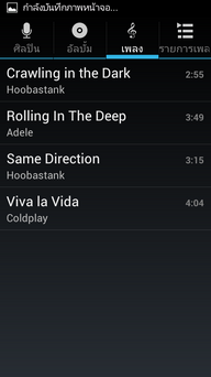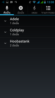 มาต่อกันที่แอพพลิเคชั่นฟังเพลงกันบ้าง ซึ่งเมื่อกดเข้าไปแล้วสามารถเลือกให้แอพพลิเคชั่นแสดงไฟล์ตามชื่อศิลปิน, อัลบั้ม, เพลง หรือแสดงเป็นรายการเพลง