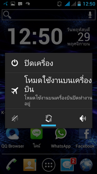และเมื่อกดปุ่ม เปิด-ปิด ค้างจะมีฟังก์ชันแสดงขึ้นมา เพื่อให้เลือก ปิดเครื่อง, เปลี่ยนเป็นโหมดเครื่องบิน, ปิดเสียง, เปลี่ยนเป็นระบบสั่น และเปิดเสียงตามปกติ