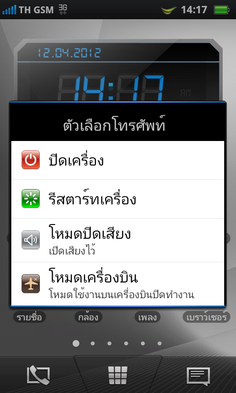 เมื่อกดปุ่มล็อกหน้าจอค้างเอาไว้ ก็จะมีเมนูสำหรับการปิดเครื่อง, รีสตาร์ทเครื่อง, โหมดปิดเสียง และโหมดเครื่องบิน ให้เลือกใช้