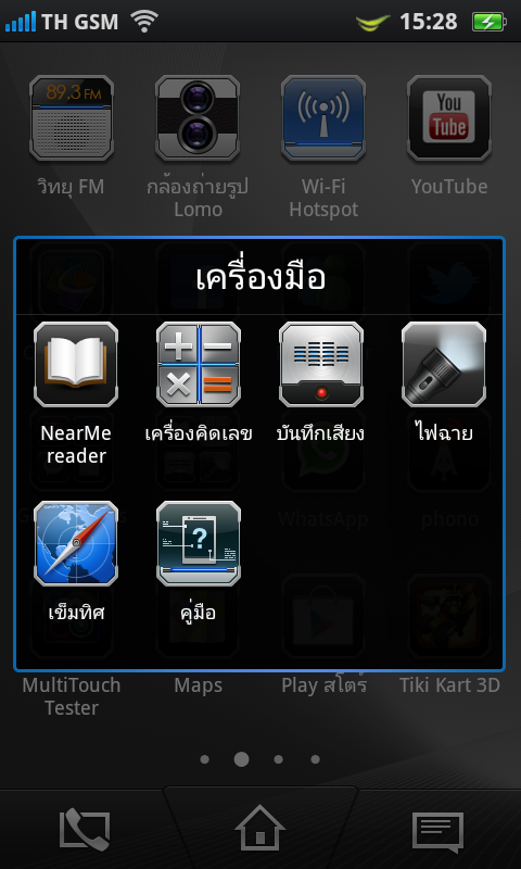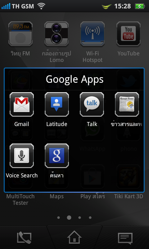 เมื่อกดปุ่มเมนูค้างเอาไว้ ก็จะมีทางลัดสำหรับการเพิ่ม, การแจ้งเตือน, วอลเปเปอร์, ค้นหา และการตั้งค่า