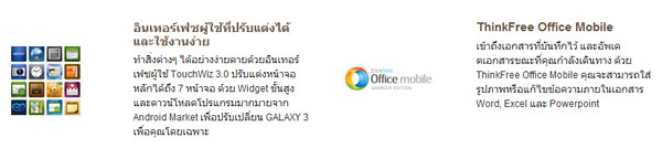 - User Interface แบบ TouchWiz UI เวอร์ชัน 3.0 ซึ่งมีความสวยงาม และปรับแต่งได้หลากหลาย