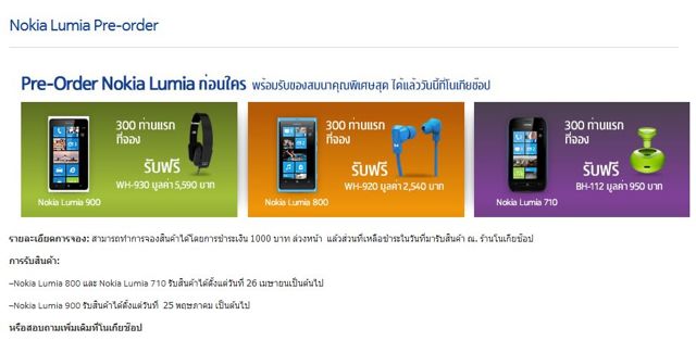 มาพร้อมกันทีเดียว 3 รุ่นเลย พร้อมของแถมก็ไม่น้อยหน้าใคร เป็นหูฟังจาก Monster ลองฟังมาแล้ว เสียงดีใช่ย่อย สีฟ้าสวยมาก ราคาก็ตามนี้เลยจ้า -Lumia 900 ราคา 18,000 บาท (ดำ/ขาว/ฟ้า) พิเศษ300 ท่านแรกรับของสมนาคุณ WH-930 มูลค่า 5,590 บาท -Lumia 800 ราคา 15,400บาท (ดำ/ขาว/ฟ้า/ชมพู) พิเศษ300 ท่านแรกรับของสมนาคุณ WH-920 มูลค่า 2,540 บาท -Lumia 710 ราคา 9,000บาท (ดำ/ขาว) พิเศษ300 ท่านแรกรับของสมนาคุณ WH-112 มูลค่า 950 บาท ส่วนตัวไปจอง Nokia Lumia 800 สีฟ้ามาละ ชอบที่สีละขนาดไม่เล็กไม่ใหญ่เกินไป Window ตัวนี้ก็ลื่นมากด้วย