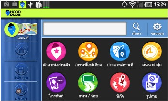 โปรแกรม Hood dude จะมีรูปไอคอนเมนูแบ่งเป็นหมวดเมนูต่างๆ โดยแบ่งเป็นหมวดหมู่ดังนี้ตำแหน่งส่วนตัว ,สถานที่ไกล้เคียง ,ประเภทสถานที่ ,ค้นหาล่าสุด ,โทรศัพท์ ,ถนน/ซอย ,พิกัด และ รูปถ่าย ซึ่งแต่ละเมนูจะช่วยให้การใงโปรแกรม GPS บนมือถือนั้นง่ายขึ้น