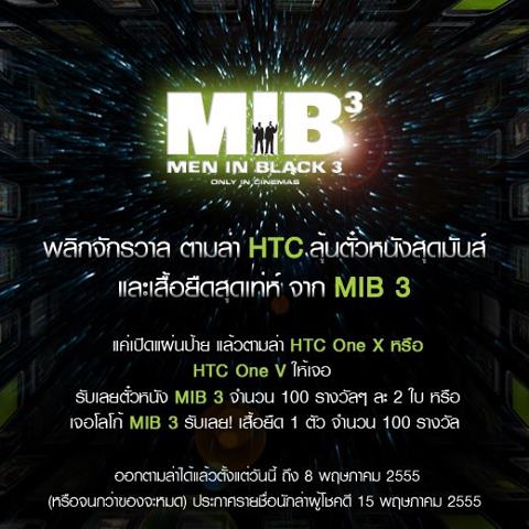 คอหนังห้ามพลาด !! แค่เข้าไปร่วมสนุกในนี้ครับ https://www.facebook.com/HTCthailand/app_248135345273021 เมื่อเปิดแผ่นป้ายเจอ HTC One X หรือ HTC One V รับไปเลย ตั๋วหนัง M.I.B 3 จำนวน 2 ใบ ประกาศรายชื่อนักล่าผู้โชคดี 15 พฤษภาคม 2555 จะหมดเขตอยู่แล้ว อย่าช้านะคะ ก่อน 8 พฤษภาคม 2555 ครับ