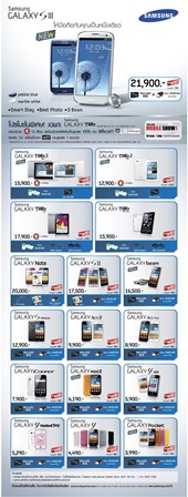 Samsung Galaxy Note 20,000 บาท รับฟรีของแถมมูลค่า 1,980 บาท S Pen Holder + HipArt Case + ตุ๊กตา Android (จำนวนจำกัด) Samsung Galaxy S2 17,500 บาท รับฟรีของแถมมูลค่า 990 บาท HipArt Case + ตุ๊กตา Android (จำนวนจำกัด) Samsung Galaxy Beam 16,500 บาท รับฟรีของแถมมูลค่า 980 บาท MicroSD 8GB + ตุ๊กตา Android (จำนวนจำกัด) Samsung Galaxy S Advance 12,900 บาท รับฟรีของแถมมูลค่า 980 บาท MicroSD 8GB + ตุ๊กตา Android (จำนวนจำกัด) Samsung Galaxy Ace 2 9,900 บาท รับฟรีของแถมมูลค่า 980 บาท MicroSD 8GB + ตุ๊กตา Android (จำนวนจำกัด) Samsung Galaxy Ace Plus 8,900 บาท รับฟรีของแถมมูลค่า 980 บาท MicroSD 8GB + ตุ๊กตา Android (จำนวนจำกัด) Samsung Galaxy Cooper 7,900 บาท รับฟรีของแถมมูลค่า 980 บาท MicroSD 8GB + ตุ๊กตา Android (จำนวนจำกัด) Samsung Galaxy Mini 2 6,190 บาท รับฟรีของแถมมูลค่า 980 บาท MicroSD 8GB + ตุ๊กตา Android (จำนวนจำกัด) Samsung Galaxy Y Duos - 5,900 บาท รับฟรีของแถมมูลค่า 980 บาท MicroSD 8GB + ตุ๊กตา Android (จำนวนจำกัด) Samsung Galaxy Y Hello Kitty 5,290 รับฟรีของแถมมูลค่า 980 บาท MicroSD 8GB + ตุ๊กตา Android (จำนวนจำกัด) Samsung Galaxy Y 4,490 รับฟรีของแถมมูลค่า 980 บาท MicroSD 8GB + ตุ๊กตา Android (จำนวนจำกัด) Samsung Galaxy Pocket 3,990 รับฟรีของแถมมูลค่า 980 บาท MicroSD 8GB + ตุ๊กตา Android (จำนวนจำกัด) *หมายเหตุ - ของสมนาคุณมีจำนวนจำกัด หรือจนกว่าของจะหมด - โปรโมชั่นนี้มีเฉพาะงาน Thailand International Mobile Show 2012 28 มิ.ย. 1 ก.ค. 2555 เท่านั้น - ขอสงวนสิทธิ์ในการแก้ไขโปรโมชั่นโดยไม่ต้องแจ้งให้ทราบล่วงหน้า
