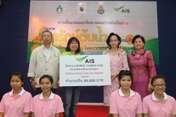 นางวิไล เคียงประดู่ ผู้ช่วยกรรมการผู้อำนวยการอาวุโส ส่วนงานประชาสัมพันธ์ บริษัท แอดวานซ์ อินโฟร์ เซอร์วิส จำกัด (มหาชน) หรือ เอไอเอส (ที่ 2 จากซ้าย) มอบทุนสนับสนุนการจัดตั้งศูนย์การเรียนรู้ให้แก่นางตรีสุคนธ์ จิตต์สงวน ผู้อำนวยการโรงเรียนสายปัญญา ในพระบรมราชินูปถัมภ์ (ที่ 2 จากขวา) ซึ่งเป็น 1 ใน 6 โรงเรียนที่ได้รับการคัดเลือกโครงงานดีเด่นจากการประกวดโครงการเรารักษ์ต้นน้ำ จาก เอไอเอส สานรัก ในปีที่ผ่านมา ทั้งนี้เพื่อให้เป็นต้นแบบในการถ่ายทอดองค์ความรู้สู่ชุมชน โดยมีนางพจมาน พงษ์ไพบูลย์ ผู้อำนวยการสำนักนวัตกรรมการศึกษา สำนักงานคณะกรรมการการศึกษาขั้นพื้นฐาน กระทรวงศึกษาธิการ (ขวาสุด) ร่วมเป็นเกียรติในงาน