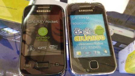ขณะที่ Samsung Galaxy Pocket ขนาด 103.7x57.5x12 มิลลิเมตร น้ำหนัก 97 กรัม ชนิดจอแสดงผลแบบ TFT LCD Capacitive Touchscreen ความละเอียด 320x240 Pixels กว้าง 2.8 นิ้ว หน่วยความจำภายในสำหรับผู้ใช้ขนาด 3 GB ...