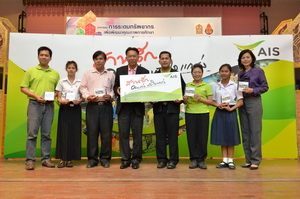 นายเลิศชัย กดทรัพย์ ผู้ช่วยกรรมการผู้อำนวยการ สำนักปฏิบัติการภูมิภาค-ภาคกลางบริษัท แอดวานซ์ อินโฟร์ เซอร์วิส จำกัด (มหาชน) หรือ เอไอเอส (ที่ 4 จากขวา) จัดโครงการสานรัก คนเก่งหัวใจแกร่งสัญจร ครั้งที่ 14 นำแบบอย่างที่ดีของเยาวชนในโครงการฯ ไปแลกเปลี่ยนแนวคิดและประสบการณ์ในการต่อสู้ชีวิต เพื่อสร้างแรงบันดาลใจให้แก่เยาวชน พร้อมทั้งมอบซีดีรายการสานรัก คนเก่งหัวใจแกร่ง เพื่อเป็นสื่อการเรียนการสอนด้านคุณธรรมและจริยธรรม โดยมี นายไพโรจน์ สุภาษิต รองผู้อำนวยการฝ่ายอำนวยการ โรงเรียนกาญจนานุเคราะห์ จ.กาญจนบุรี (ที่ 4 จากซ้าย) รับมอบ ณ หอประชุมโรงเรียนฯ