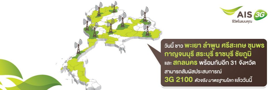 เพื่อนๆ ต่างจังหวัดได้เฮ! กันแน่ๆ เพราะตอนนี้ AIS 3G 2100 MHz มีเครือข่ายครอบคลุมหัวเมืองแล้ว 31 จังหวัด ด้วยสถานีฐานราว 5,000 แห่ง เดือนกรกฎาคม จะครอบคลุมหัวเมือง 67 จังหวัด กับ 6,000 สถานีฐาน และจะครอบคลุมหัวเมืองทั้ง 77 จังหวัดภายในเดือนสิงหาคม 56 สถานีฐานมากกว่า 8,000 แห่งและเครือข่ายในอาคารมากกว่า 1,000 แห่ง เช็คพื้นที่ให้บริการได้ที่นี่ http://www.ais.co.th/3g/th/coverage-checker.aspx#tips