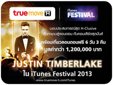 มากรี๊ดสุดเสียงในคอนเสิร์ตสุดมันส์ ไปกับศิลปินสุดฮอต Justin Timberlake ใน iTunes Festival 2013 ครั้งแรกเมื่อ Apple และทรูมูฟ เอช ให้คุณลุ้นชมคอนเสิร์ตระดับโลก ที่รวมกว่า 60 ศิลปินดังทั่วโลก มาแสดงทุกคืนตลอดเดือนกันยายน ณ กรุงลอนดอน ประเทศอังกฤษ บัตรเข้าชมคอนเสิร์ตหายากมากๆ และไม่มีขายทั่วไป แต่วันนี้มีข่าวดีมาแจ้ง ซึ่งบอกได้เลยว่าสิทธิพิเศษสำหรับลูกค้าทรูมูฟ เอช รายเดือน รับ 1 สิทธิ พิเศษอีกขั้น